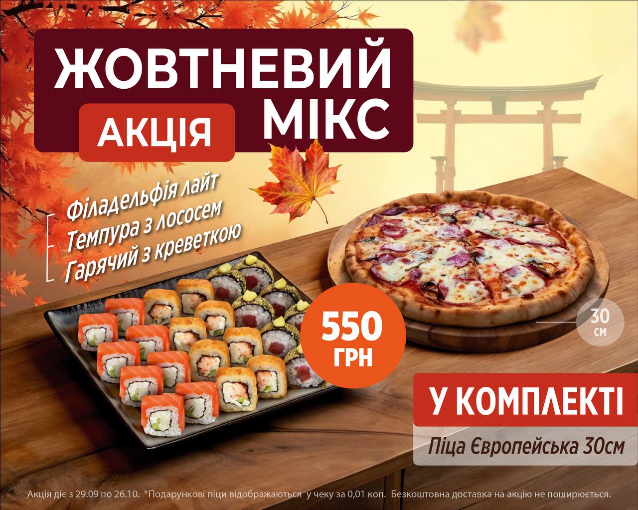 Рол Каліфорнія з лососем/ Рол Каліфорнія з креветкою/ Рол Інь-янь лосось-креветка/ Рол Гарячий з креветкою/ Рол Темпура з лососем