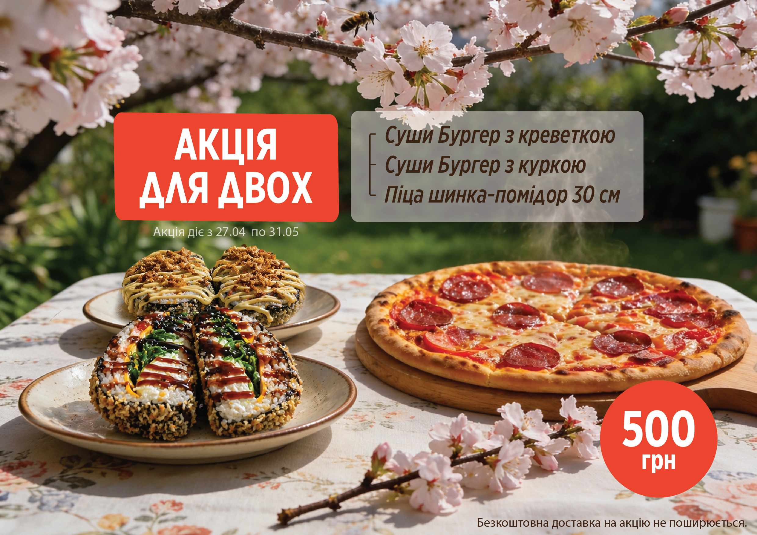 Суши Бургер з креветкою/Суши Бургер з куркою/Піца шинка-помідор 30 см (Безкоштовна доставка на акцію не поширюється)